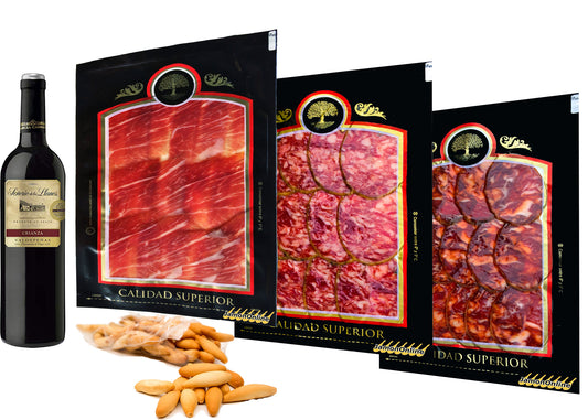 Lote Degustación: Jamón de bellota, Lomo de bellota, Cecina de Vacuno, Chorizo de bellota, Salchichón de bellota, Queso Oveja. (100 g de cada). Recién Cortado el Mismo Día.